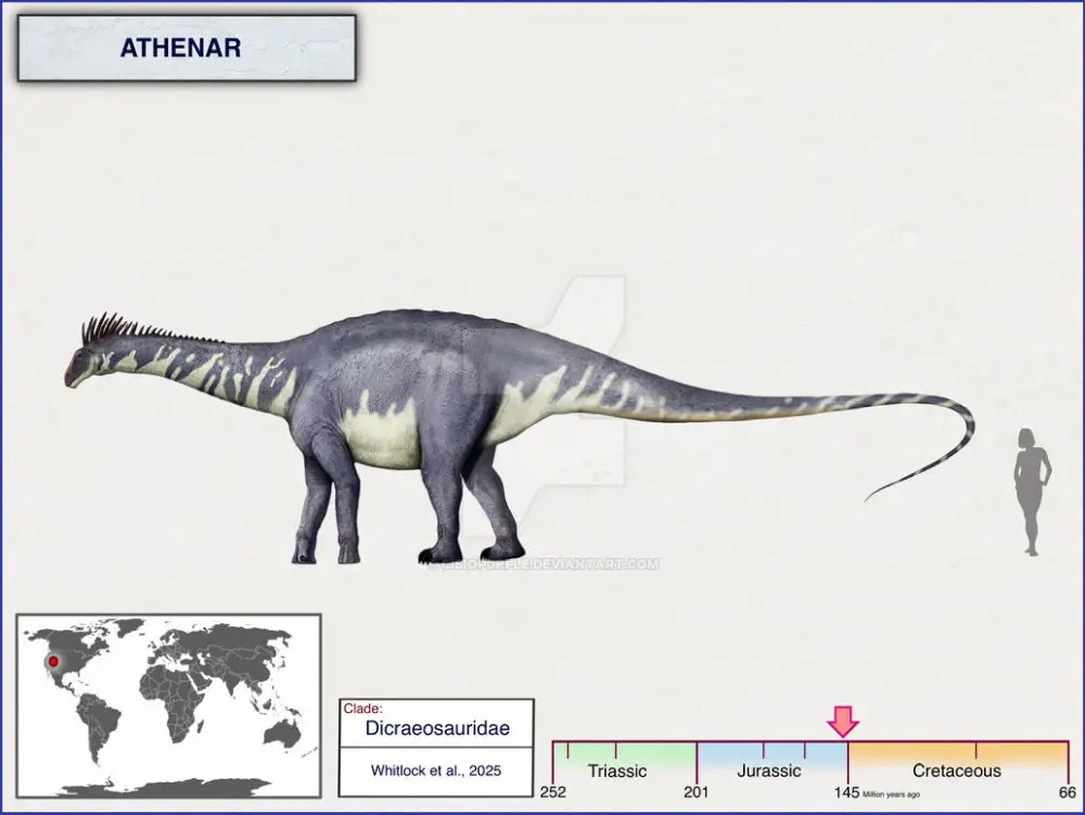 Відомо, що три інші таксони дикраеозавридів були сучасниками Athenar: Kaatedocus, Smitanosaurus і Suuwassea. Цей таксон має помітні відмінності в анатомії черепа порівняно з усіма трьома, і, ймовірно, був більшим за розміром у дорослому віці та молодшим за віком, ніж Suuwassea. Однак як у Suuwassea, так і в Athenar лобна кістка входить до складу надскроневого вікна, що може вказувати на близьку спорідненість між цими двома таксонами. Цей таксон також має спільні риси з не північноамериканськими дикраеозаврами, такими як Amargasaurus.